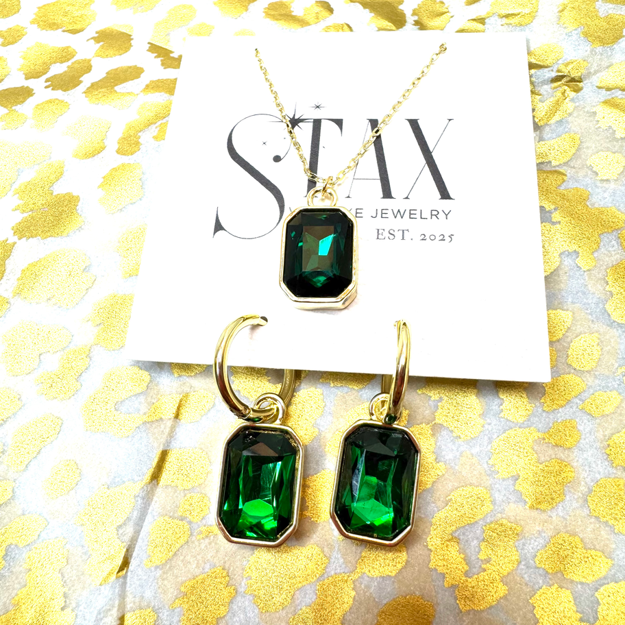 Rich emerald green zirconia crystal rectangle pendant earring and necklace. Earring hoop that closes securely. Perfect for layering with other pieces within the Eden collection.