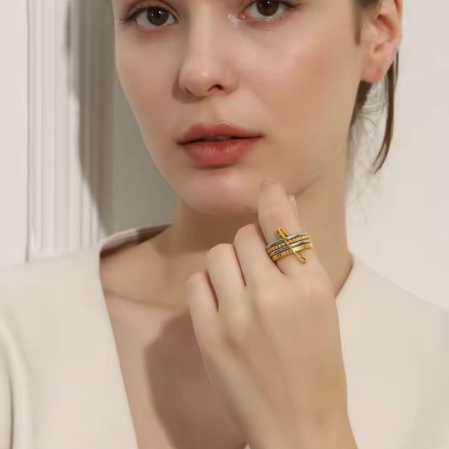 4 layer safety pin ring stack. Zircornia crystal enlay with two tone design. 18k gold plated with stainless steel.