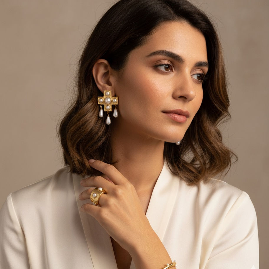 18k gold plated earring, ring and bracelet set. Gorgeous cross post stud earring with pearl tear drop earring. Cuff gold plated bracelet with pearl and zirconia encrusted through out. Hammered ring with pearl enlays.