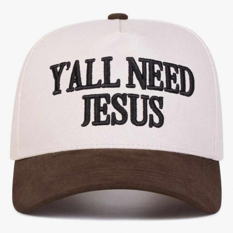 Chocolate and cream, Yall Need Jesus baseball hat.